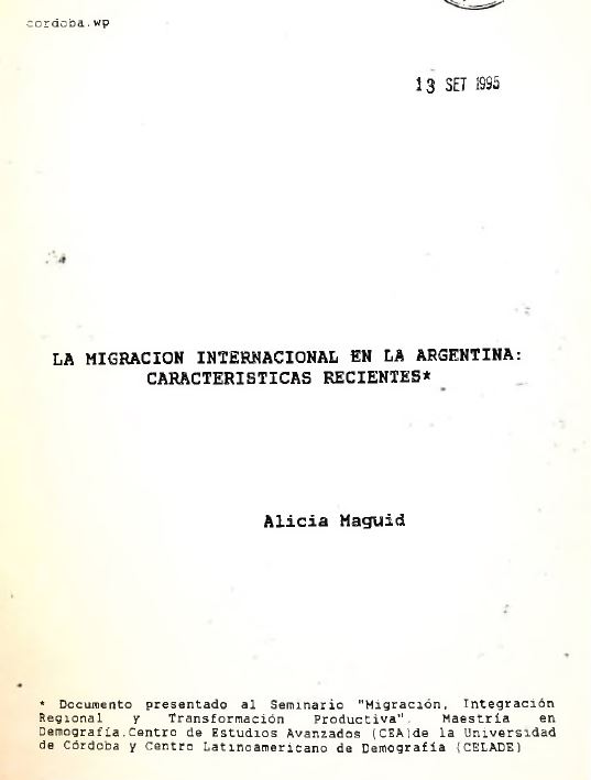 Notas: Documentos presentado al . Palabras claves: MIGRACION; INMIGRACION; INMIGRANTES; EDUCACION; MERCADO DE TRABAJO. EXTRANJEROS; DISTRIBUCION DE LA POBLACION; MIGRANTES; GRUPOS DE EDAD; DESEMPLEO; POBLACION ACTIVA; PEA; SUBEMPLEO.