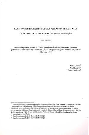 Resumen: Se centra la atención en la problemática educacional de los hogares particulares con menores de 6 años a 13 años, abarcando en forma completa las edades típicas de asistencia al nivel primario de educación formal. Palabras claves: EDUCACION; METODOLOGIA. POBLACION; NIVEL EDUCATIVO; GRUPOS DE EDAD; INDICADORES; DATOS CENSALES.